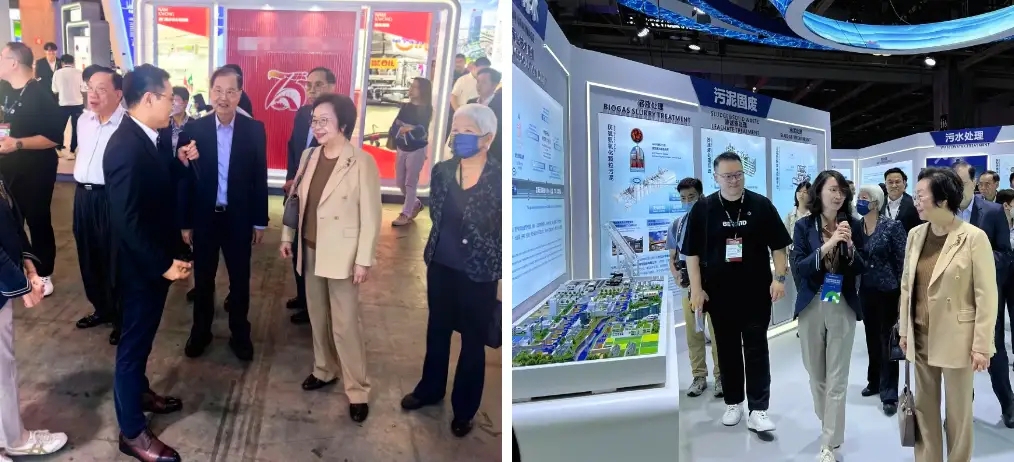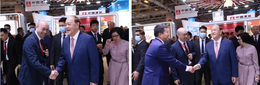 5月23日,澳门特别行政区行政长官贺一诚到北控水务集团展位参观指导,集团副总裁冒建华、总裁助理黎定高热情接待。
