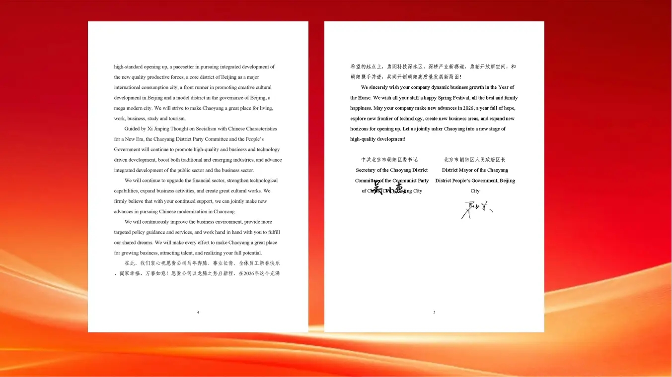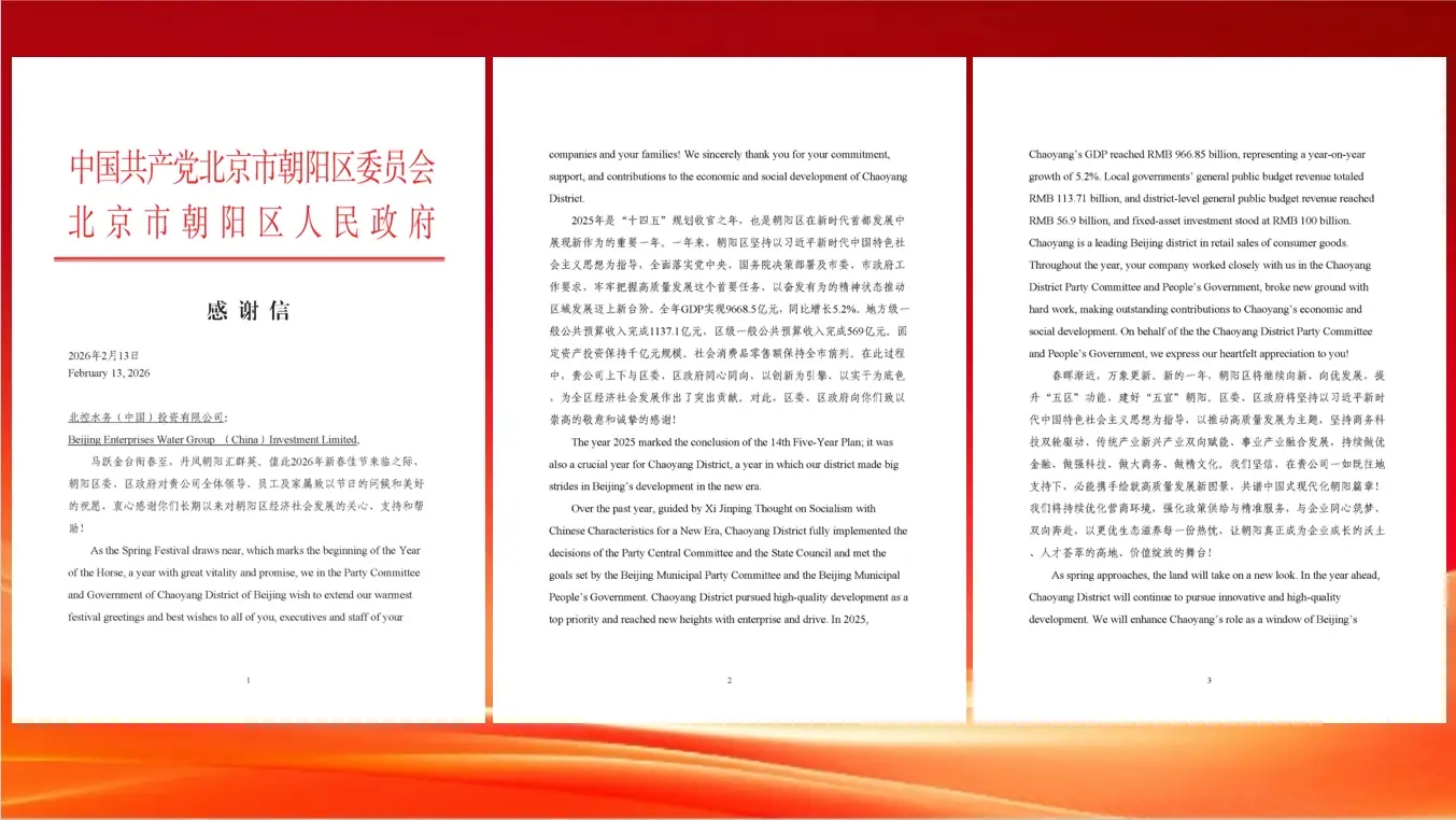 马跃金台衔春至,丹凤朝阳汇群英。值此2026年新春佳节来临之际,北控水务集团收到北京市朝阳区委、区政府感谢信,并向集团全体领导、员工及家属致以节日的问候和美好的祝愿。