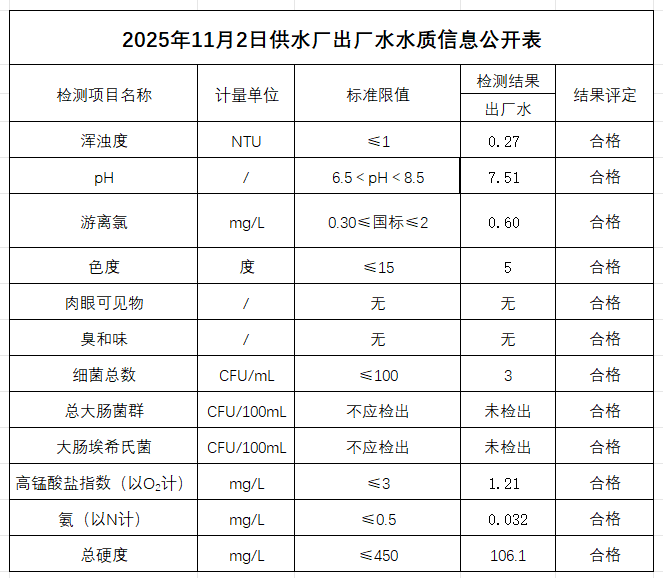 2025年11月2日供水厂出厂水水质信息公开表